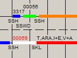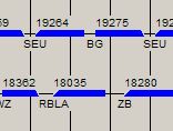 Each colored bar on such a line marks either a ride between two end-stations or a maintenance stop (red). The color of the bar shows the type of the ride (productive, empty movement, etc.). A rotation is a periodic route of one or more train units. Rotations are separated by dashed lines.