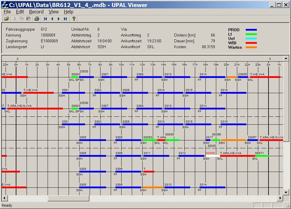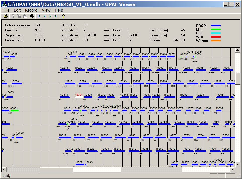 All input and output is read from and written into a standard database. An additional stand-alone viewer reads this database and visualizes the rolling stock rostering in a user-friendly and intuitive way.